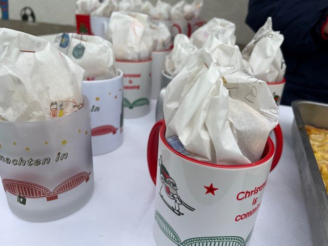 Für den ersten schuleigenen Weihnachtsmarkt hatte sich die Klasse 4a im Vorfeld etwas besonderes überlegt. Gemeinsam mit den Klassenlehrkräften wollte man die Schulgemeinschaft überraschen und Kekse in Weihnachtstassen anbieten. Die Kekse sollten natürlich selbstgemacht sein, weswegen man sich an einen Schultag komplett in die Mensa zurückzog. Dort wurden zunächst die Kekse ausgestochen und danach mit Zuckerguss und Schokostreuseln oder Zuckerperlen verziert. An dieser Weihnachtsbäckerei hatten alle Kinder mächtig Spaß und man war auch äußerst produktiv. Nicht nur den Kindern schmeckten die Kekse ganz hervorragend.