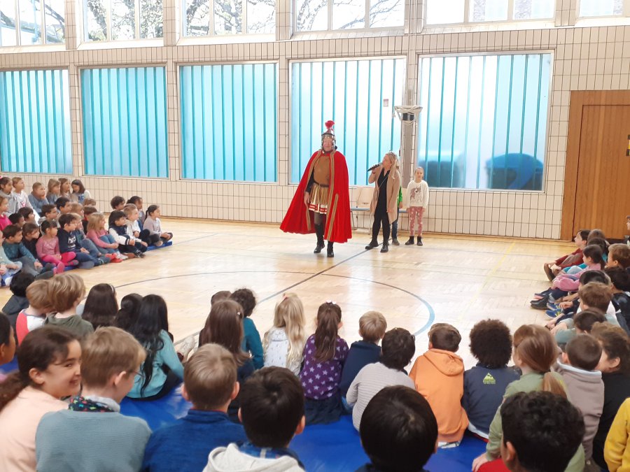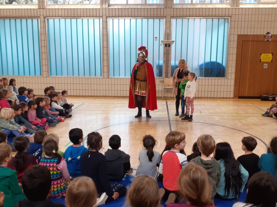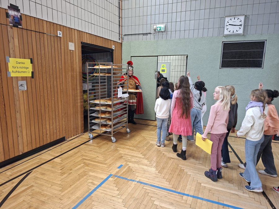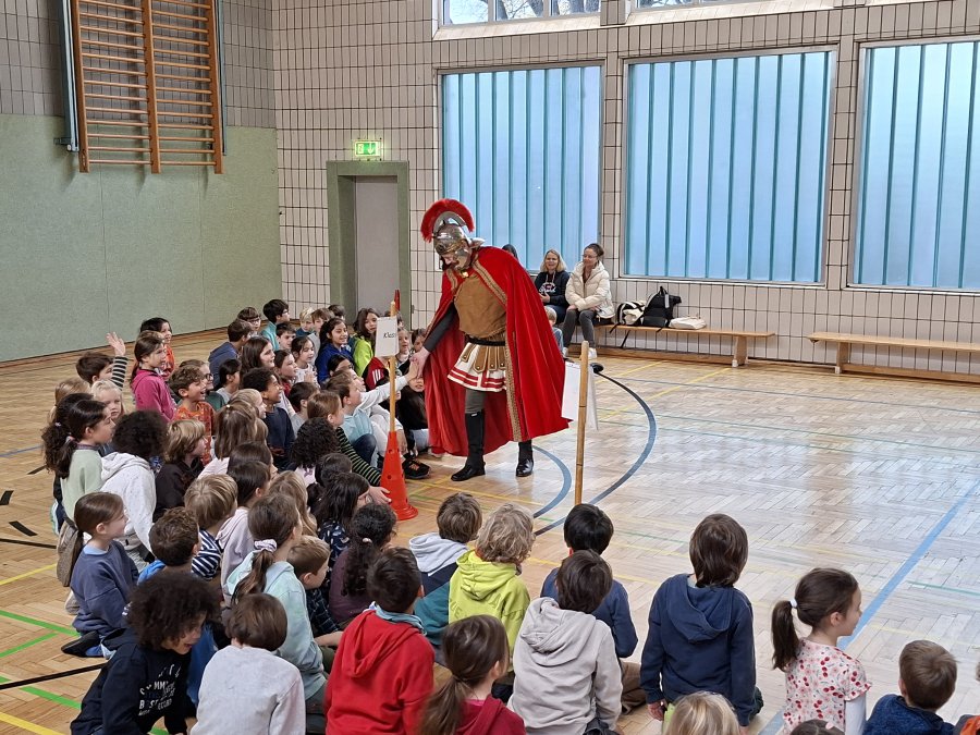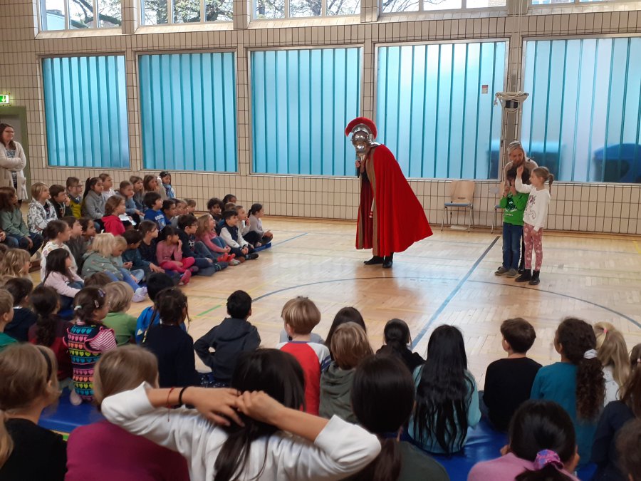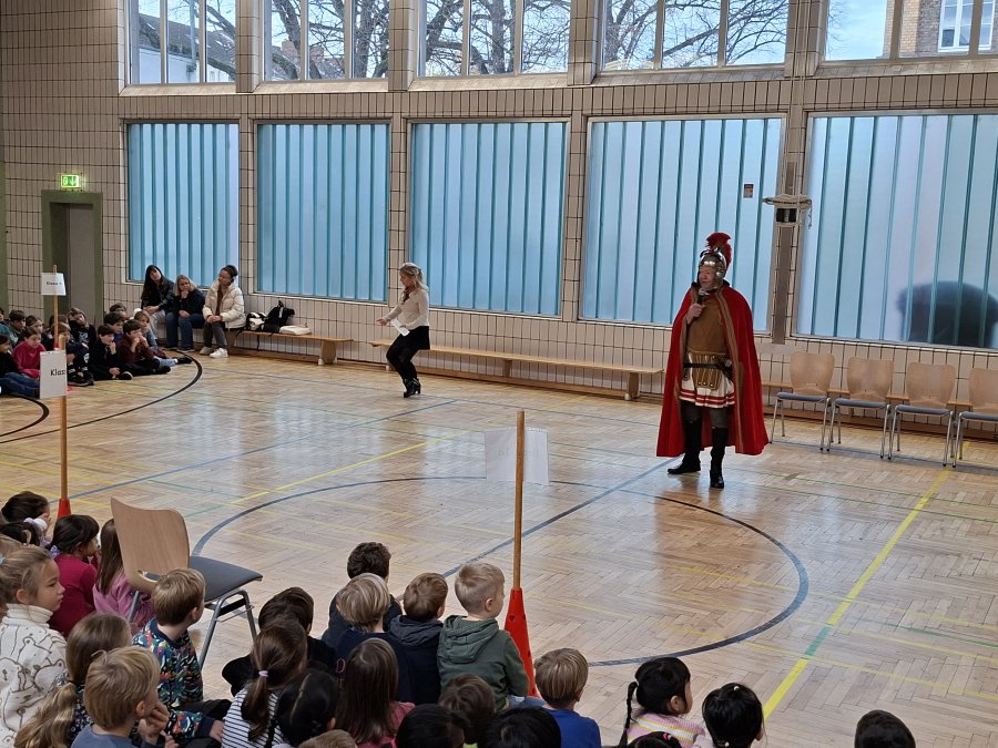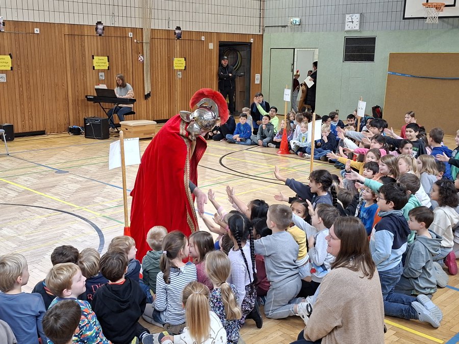 Auch in diesem Jahr traf sich am Vormittag des 12. Novembers 2025 wieder die gesamte Schulgemeinschaft in der Turnhalle, um für den abendlichen Martinszug noch einmal die Martinslieder zu üben. Alles schien wie immer. Frau Rother begleitete auf dem Klavier und die Kinder sangen mit großer Begeisterung die drei Strophen zum Martinsklassiker “Durch die Straßen auf und nieder”. Während der zweiten Strophe des Liedes “Sankt Martin” öffnete sich jedoch die Tür des Turnhallen-Notausganges und eben dieser Sankt Martin kam zur Tür herein. Er berichtete, dass er bei seinem morgendlichen Ausritt am Rhein den Gesang der Kinder gehört hätte und daraufhin doch mal vorbeischauen wollte.