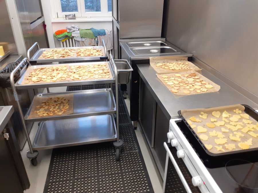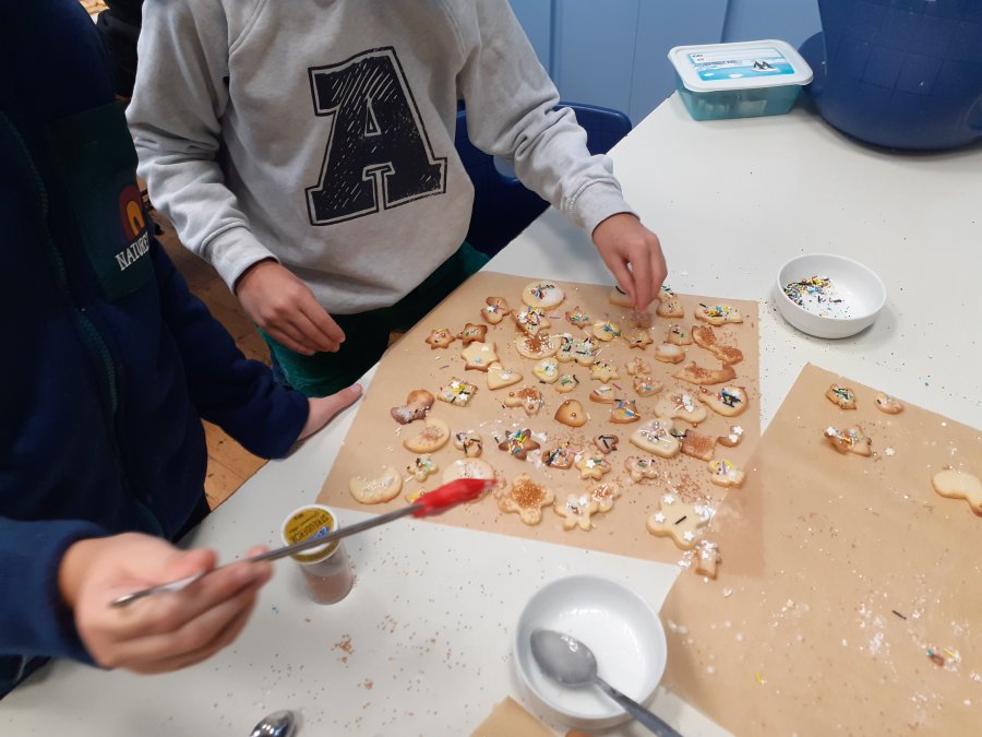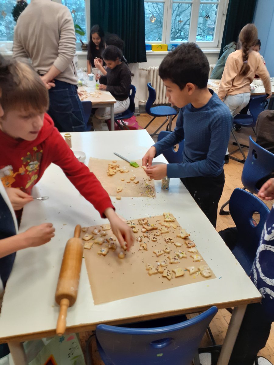 Für den ersten schuleigenen Weihnachtsmarkt hatte sich die Klasse 4a im Vorfeld etwas besonderes überlegt. Gemeinsam mit den Klassenlehrkräften wollte man die Schulgemeinschaft überraschen und Kekse in Weihnachtstassen anbieten. Die Kekse sollten natürlich selbstgemacht sein, weswegen man sich an einen Schultag komplett in die Mensa zurückzog. Dort wurden zunächst die Kekse ausgestochen und danach mit Zuckerguss und Schokostreuseln oder Zuckerperlen verziert. An dieser Weihnachtsbäckerei hatten alle Kinder mächtig Spaß und man war auch äußerst produktiv. Nicht nur den Kindern schmeckten die Kekse ganz hervorragend.