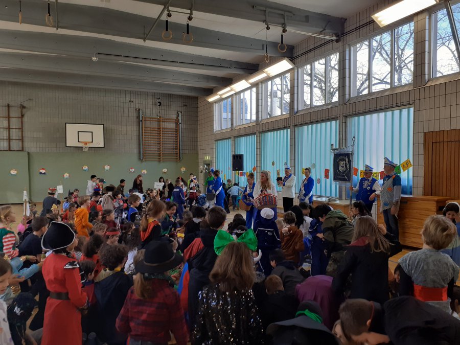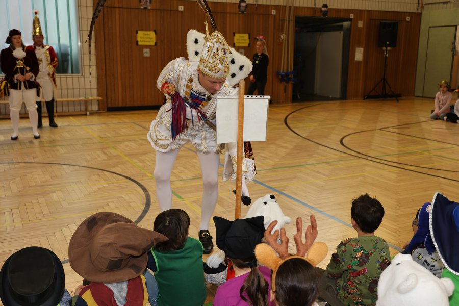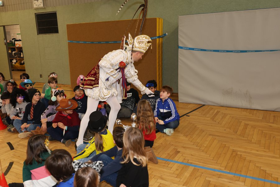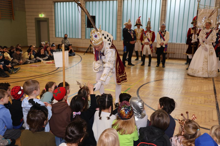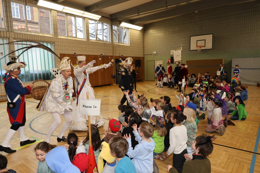 Bei Karnevalsmusik und unter lautem Beifall der Kinder lief das Bonner Prinzenpaar zusammen mit dem Festausschuss Bonner Karneval sowie einer Equipe aus Stadtsoldaten, Ehrengarde und weiteren Karenevalsgruppen um 9.00 Uhr in die Turnhalle ein. Sowohl der Prinz als auch die Bonna sprachen mit den Kindern, erzählten vom Bonner Karnevalsbrauchtum und erklärten den Kindern die Kostüme sowie die weiteren Utensilien, die man zu Karneval als Prinzenpaar so dabei hat.