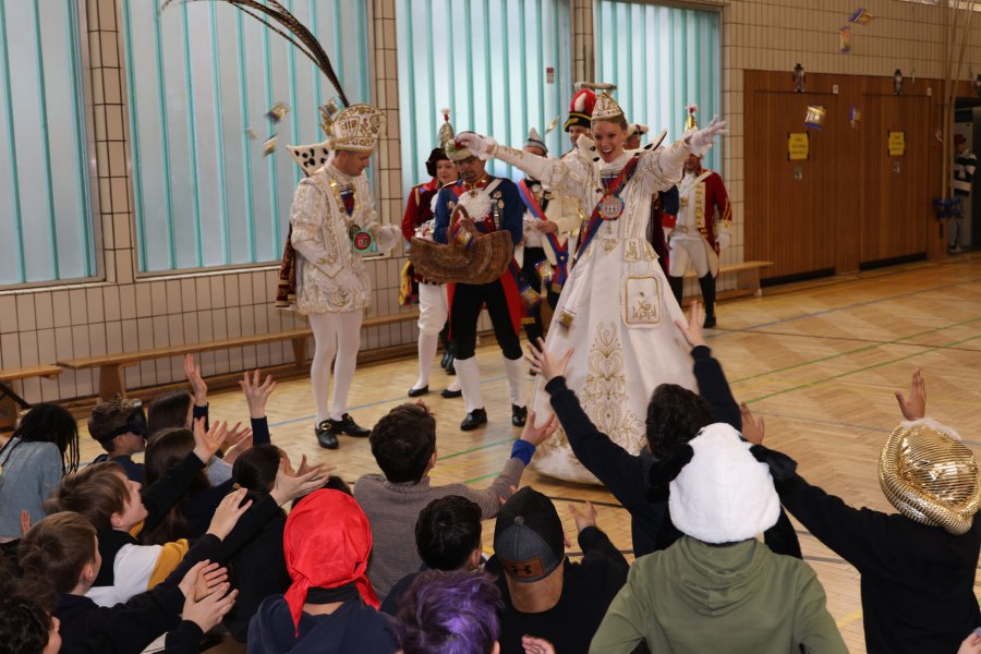Am Dienstag, den 10.02.2026, durfte sich die Stiftsschulgemeinschaft über hohen Besuch an der Schule freuen. Das diesjährige Bonner Prinzenpaar mit Prinz Roland I. und Bonna Stephanie III. waren zu Gast. Mit dabei war auch das diesjährige Kinderprinzenpaar mit Kinder-Prinz Noah I. und Kinder-Bonna Leonie I. Unter tosendem Applaus und dem lautstarken Gesang des traditionellen Karnevalsliedes “Der schmucke Prinz” betraten die Prinzenpaare samt ihrem Gefolge die Tunrhalle und stimmten die Kinder auf die anstehenden Karnevalstage ein. Selbstverständlich hatte der Besuch auch reichlich Kamelle und einen Prinzenorden, den Schulleiterin Eva Schmitt stellvertretend für die gesamte Stiftsschule entgegennahm, mit dabei.