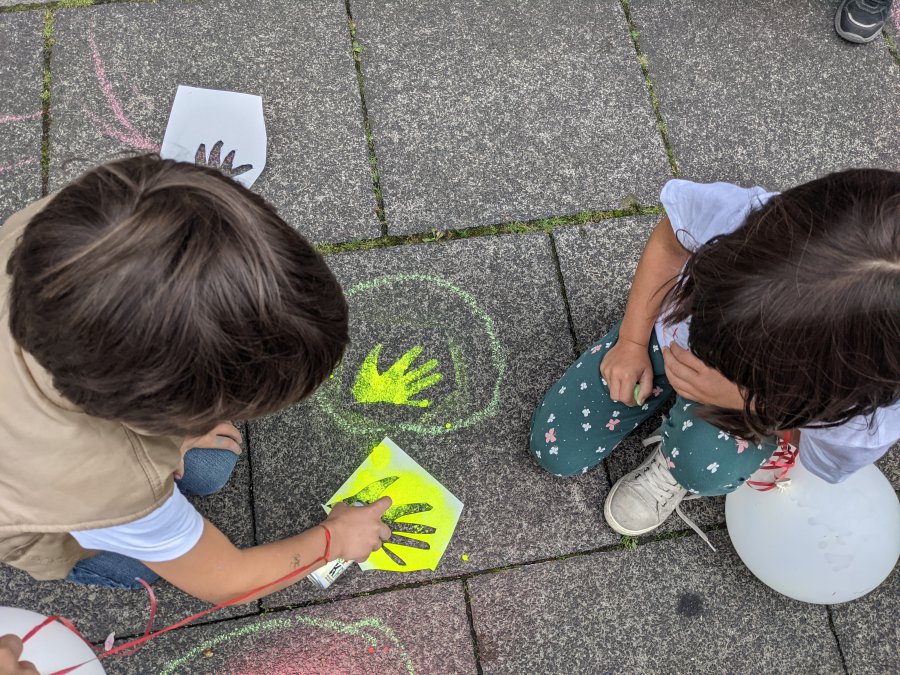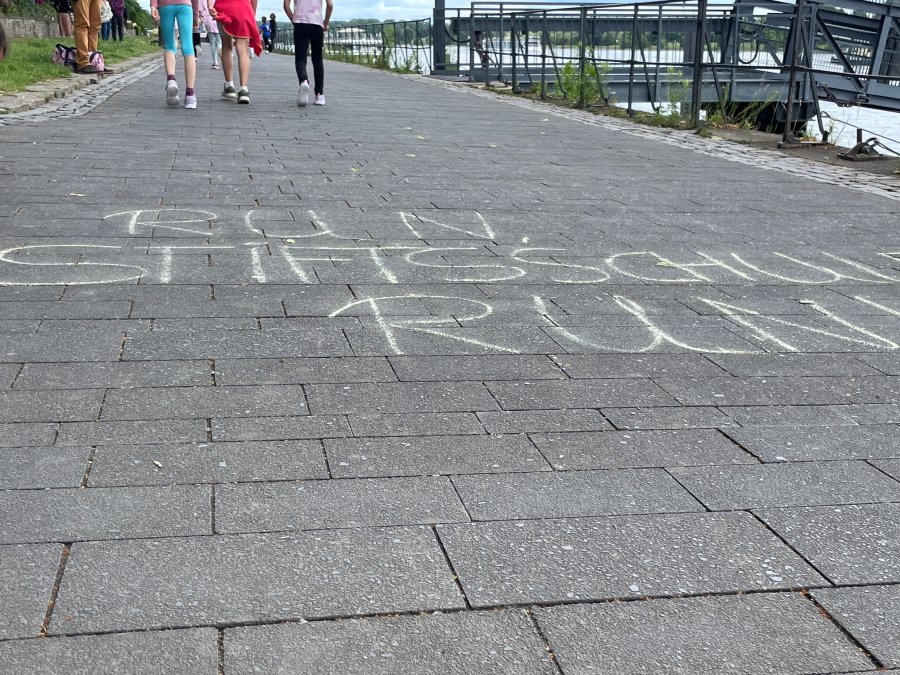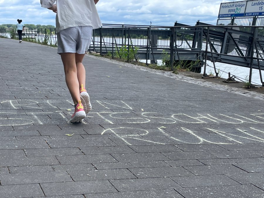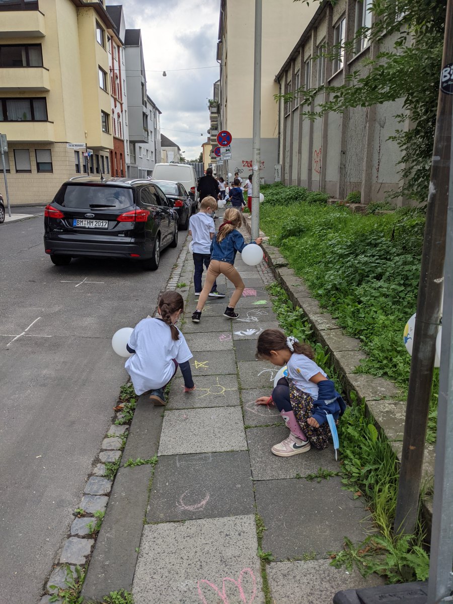 An drei aufeinanderfolgenden Tagen haben wir eine lange Spur, bestehend aus Handabdrücken und Zeichnungen der Kinder, durch die Innenstadt gezogen. Ausgehend von der Schule, über das Rheinufer bis hin zum Hofgarten und dem Endpunkt Kreuzkirche. Mit bunten Farben, bemalten Aktionsshirts und viel Freude waren alle mit dabei.