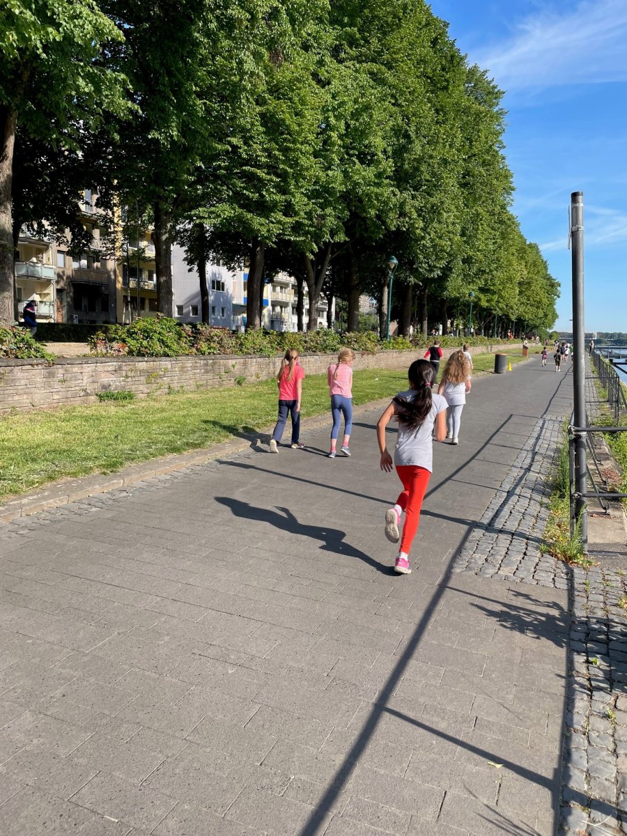 markierten: Von der Einmündung Theaterstraße führte die knapp 700m lange Strecke Richtung Kennedybrücke am Rhein entlang und zurück. Nach dem Startsignal durch Schulleiterin Eva Schmitt setzen sich die Kinder in Trab – jedes Kind im eigenen Tempo, in wechselnden kleinen Gruppen oder als ruhig dahinlaufende Einzelkämpferinnen und Einzelkämpfer. Nach 45 Minuten liefen alle stolz auf ihre erreichte Rundenzahl ins Ziel. Es folgte der Lauf der dritten und vierten Klassen, die ebenfalls durch große Ausdauer und Lauffreude glänzten.