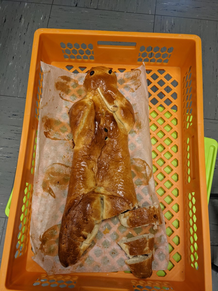 Als wir in der Schule ankamen hat jede Klasse einen Riesen-Weckmann bekommen. Den haben wir uns dann in der Klasse geteilt. Der war seeeehr lecker.