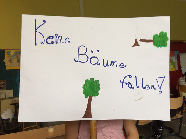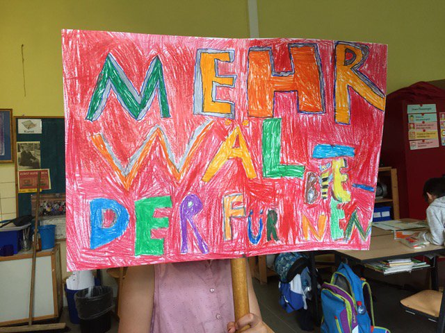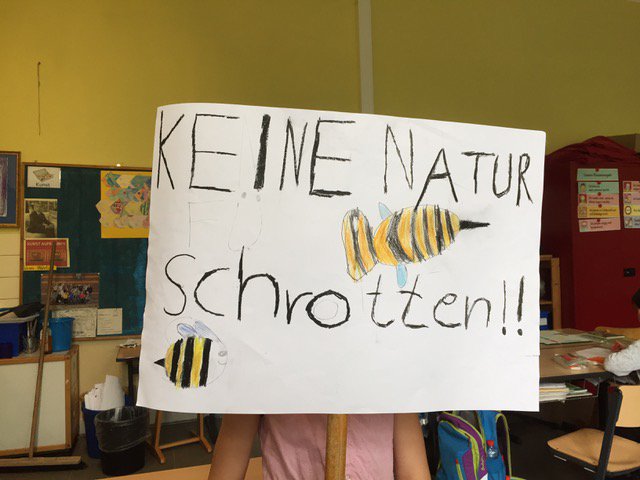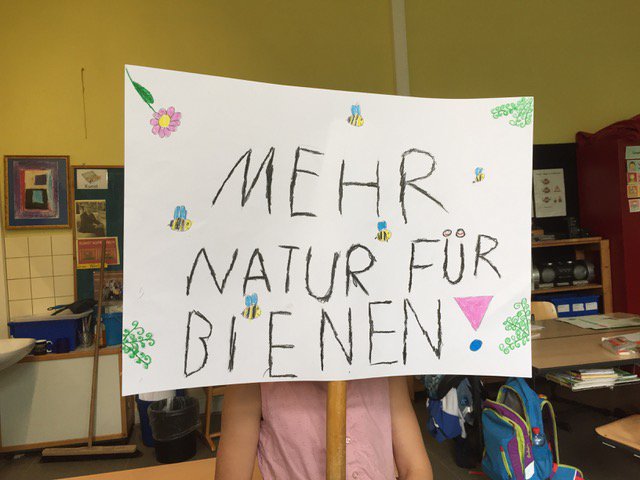 Weltweit nimmt die Vielfalt der Insekten ab. Dieser Rückgang der Insekten hat Folgen für das gesamte Ökosystem. Was können wir tun, um diesem Problem zu begegnen? Für die Schülerinnen und Schüler ist diese Frage wichtig. Sie wollen mithelfen, dass es besser wird, sie wollen sich einmischen. Im Unterricht wurde dieses Anliegen durch die Vorbereitung einer „Bienen-Demo“ unterstützt. Plakate wurden geschrieben, Forderungen notiert. Die „Bienen-Demo“ wurde samt Megaphon auf dem Schulhof abgehalten. Und auf dem alljährlichen Schulfest soll es einen Bienen-Stand geben, der unter anderem auch die aktuellen Forderungen der Kinder öffentlich macht.
