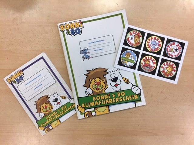 Heimat am Nordpol verlassen, weil es in der Arktis immer wärmer wird und das Eis schmilzt. Er hat sich auf den Weg gemacht die Ursachen dafür zu finden und dabei seinen Weggefährten Bo, den Löwen, dazu eingeladen ihn auf seiner Reise zu begleiten. Gemeinsam zeigen sie Kindern klimaschädigendes Verhalten im Alltag auf. Die Unterrichtsreihe beinhaltet ein Arbeitsheft, das Bonni und Bo Lied, Bilder zum Ausmalen, Videos zum Thema Klimawandel und ein Begleitheft, den Klimaführerschein, in welchem die Kinder Stempel für erfolgreich erledigte Aufgaben sammeln. Die Lehrer/innen werden im Vorfeld zu einer etwa 1 stündigen Fortbildung eingeladen und erfahren die wichtigsten Eckpunkte des Projekts. Bei dem Projekt zur Umweltbildung erfahren und erleben die Kinder aktiv beteiligt und Aufgabe für Aufgabe, auf welche Weise das Klima jeden Tag geschädigt wird und wie sie diesen Kreislauf durchbrechen können.