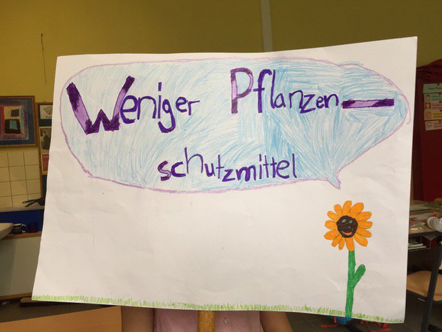 Weltweit nimmt die Vielfalt der Insekten ab. Dieser Rückgang der Insekten hat Folgen für das gesamte Ökosystem. Was können wir tun, um diesem Problem zu begegnen? Für die Schülerinnen und Schüler ist diese Frage wichtig. Sie wollen mithelfen, dass es besser wird, sie wollen sich einmischen. Im Unterricht wurde dieses Anliegen durch die Vorbereitung einer „Bienen-Demo“ unterstützt. Plakate wurden geschrieben, Forderungen notiert. Die „Bienen-Demo“ wurde samt Megaphon auf dem Schulhof abgehalten. Und auf dem alljährlichen Schulfest soll es einen Bienen-Stand geben, der unter anderem auch die aktuellen Forderungen der Kinder öffentlich macht.