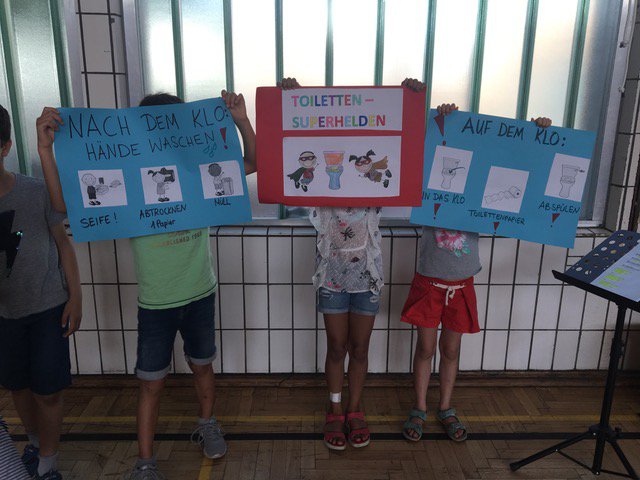 En junio de 2019 se reunieron por primera vez todos los niños y maestros de la Stiftsschule en el gimnasio del colegio para exponer temas interesantes para ellos, pero también para presentar poemas o chistes. Antes se habían reunido los delegados de las clases con la dirección del colegio y habían expuesto los temas tratados en los consejos de clase, los cuales tienen lugar regularmente. Se presentaron, por ejemplo, “sketchs” cortos sobre las reglas escolares que se habían elaborado antes para recordárselas a todos los niños. ¿Cómo he de comportarme en la escuela? Se recordó igualmente que la regla “SDD”, es decir, “en silencio, despacio y por la derecha” a ayuda a bajar por la escalera. Los “superhéroes de los baños” explicaron a los niños de una manera muy clara la forma de comportarse en los lavabos y la “regla ¡alto!” es útil si hay conflictos o problemas. Además, fue presentado a los niños el colegio “Max Uhle”, nuestra escuela asociada en Arequipa, Perú. Para terminar, los alumnos del 4.° curso cantaron la canción „Ein Hoch auf uns! (Un brindis por nosotros)“