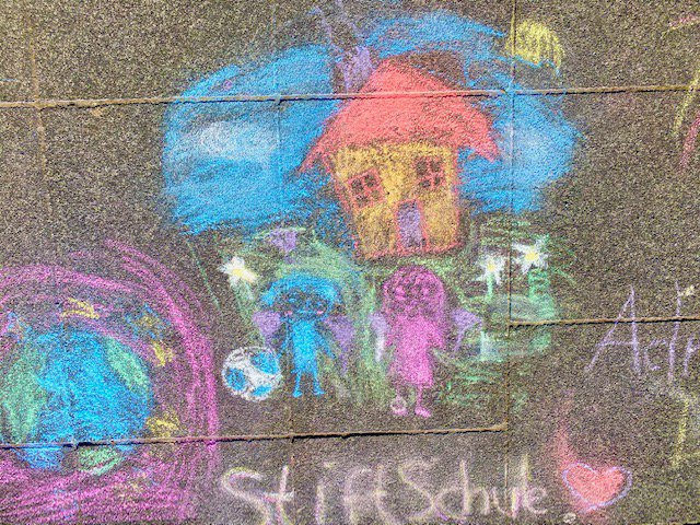 En los úItimos meses nuestra vida cotidiana se ha restringido mucho por culpa del coronavirus. Sobre todo, los niños también se han sentido afectados por las restricciones. Muchas fiestas y eventos públicos fueron cancelados. Fieles al lema de este año: „Día Universal del Niño 2020 – ¡AHORA MÁS QUE NUNCA! ¡LOS NIÑOS CONQUISTAN LAS CALLES!“; todos los alumnos de la Stiftsschule salieron de la escuela y con sus coloridos dibujos en diferentes lugares en las inmediaciones del colegio embellecieron el entorno y llamaron la atención sobre sus derechos.